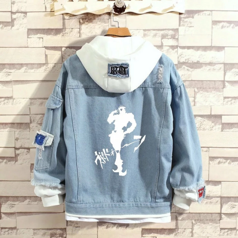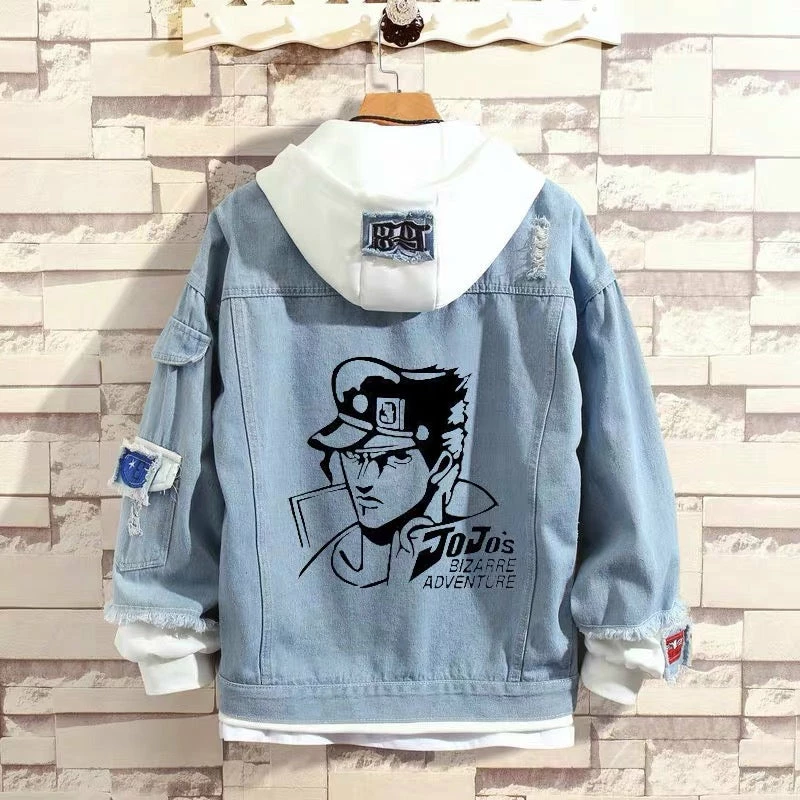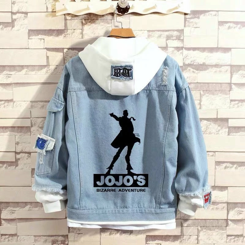 Selected denim fabric with back prints of JoJo’s Bizarre Adventure classic symbols from the Japanese manga series. Stylish design combined both hoodie and jacket, it will definitely make you the most stunning star in the street.