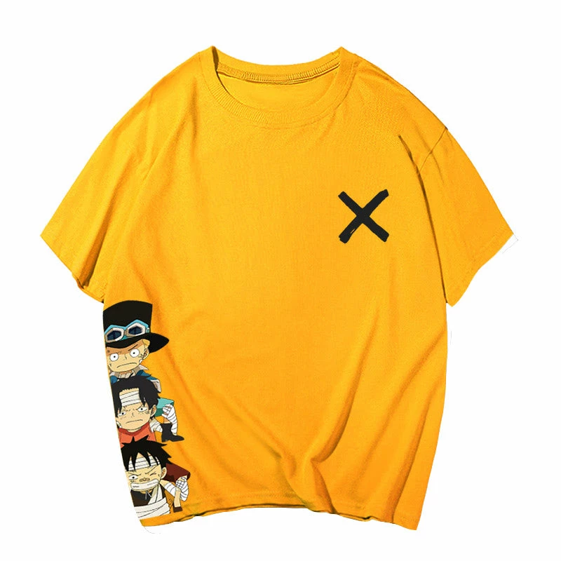 Show everyone that you mean business when it comes to adventuring (as long as that business is also fun) with this summer tee from One Piece. Featuring the cartoon Monkey D. Luffy, Ace and Sabo as well as cross mark design. Multiple colors available.