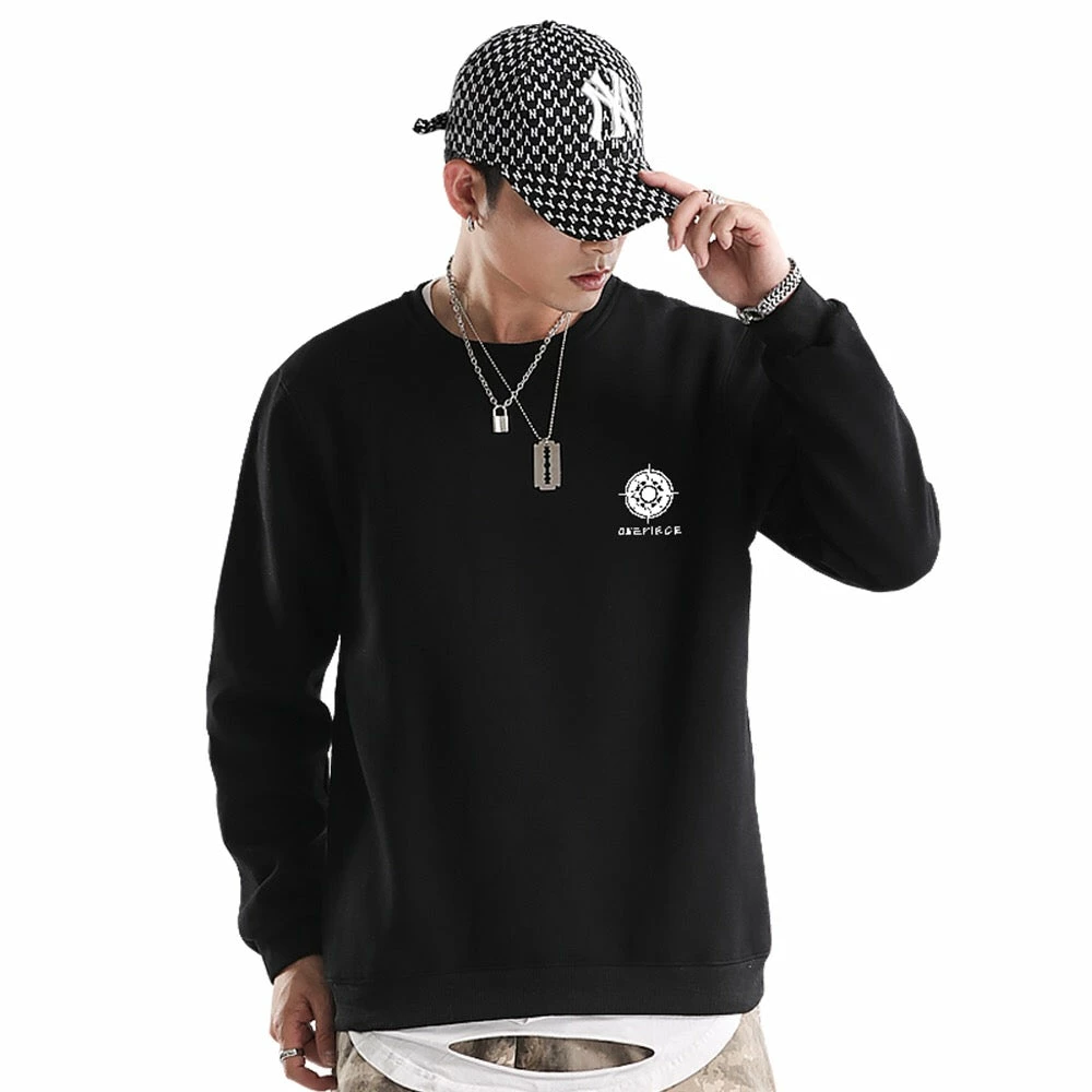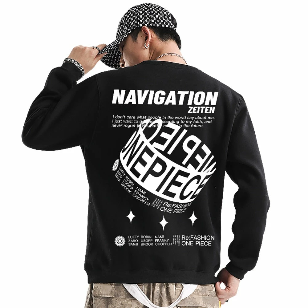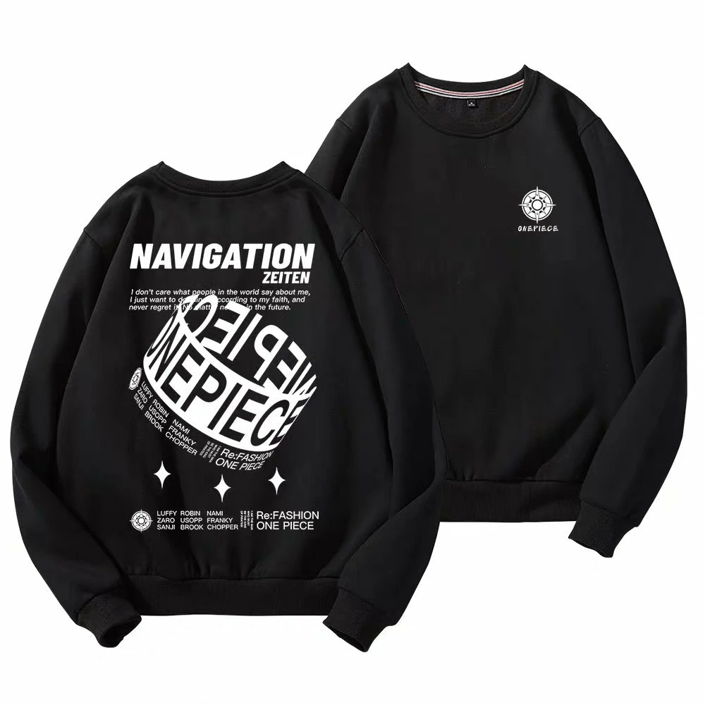 Correct navigation is an eternal target during the voyage. That’s what this sweatshirt about. One Piece spiral design at back center.