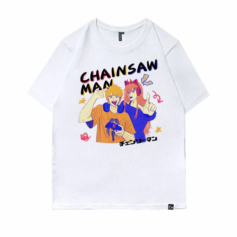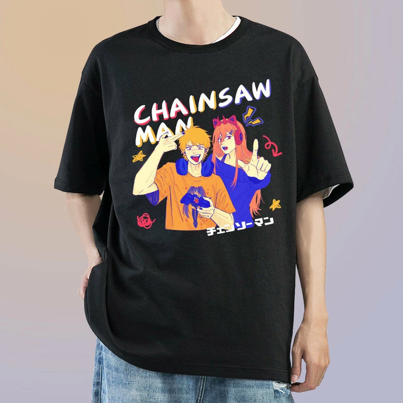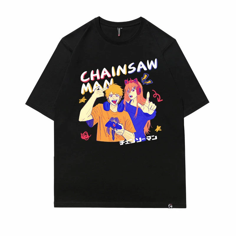 Front graphic prints Denji and Power wearing the earphone and they are ready to sing.