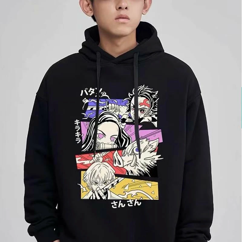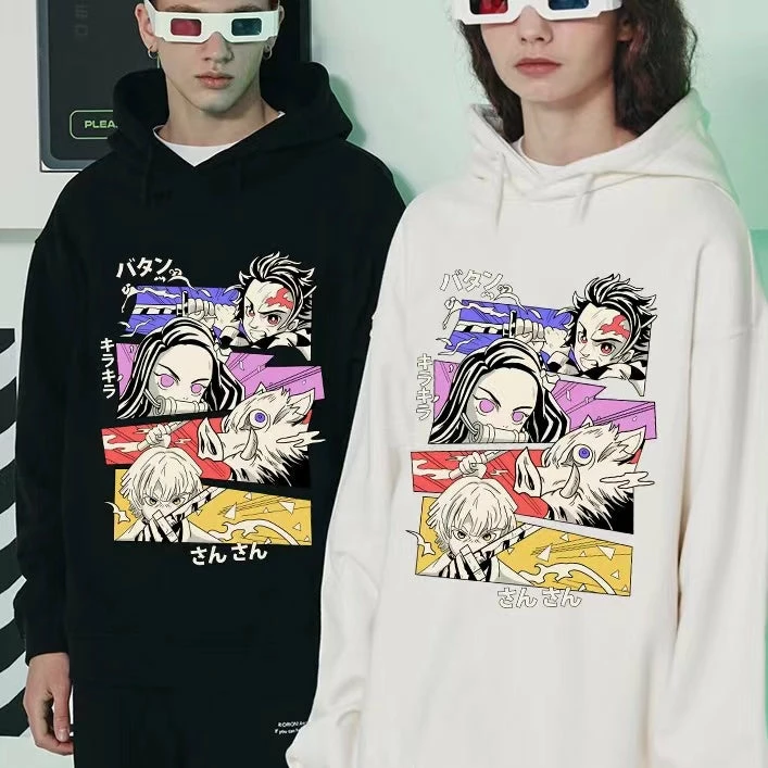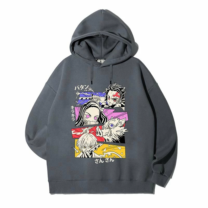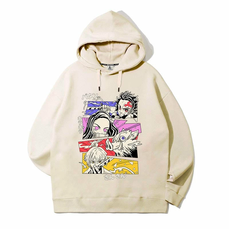 Featuring a print of Tanjiro, Nezuko, Zenitsu and Inosuke in each colorful straps in front.