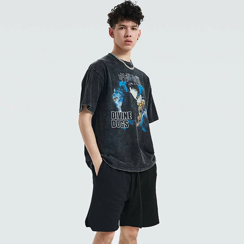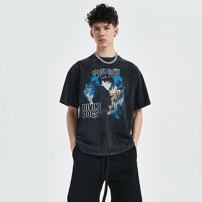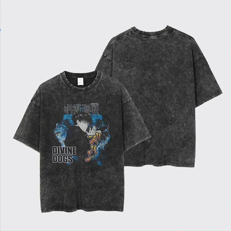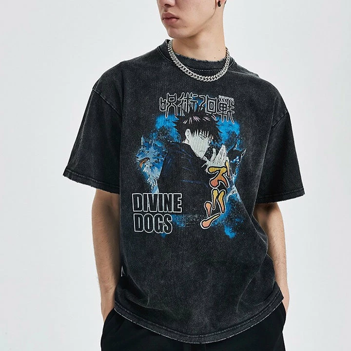 Front printing of Megumi Fushiguro from Jujutsu Kaisen and Divine Dogs as the background. Streetwear design.