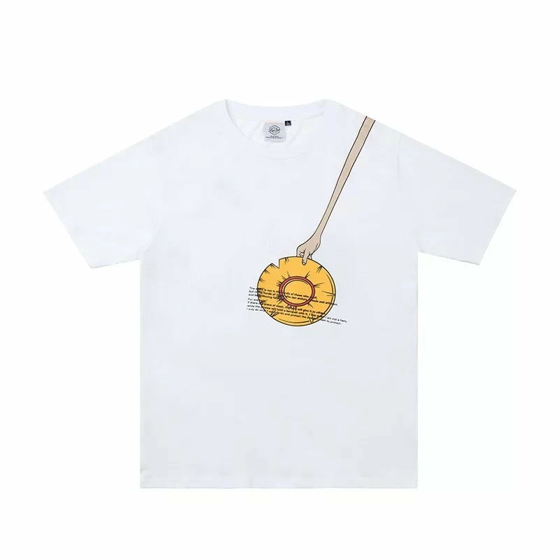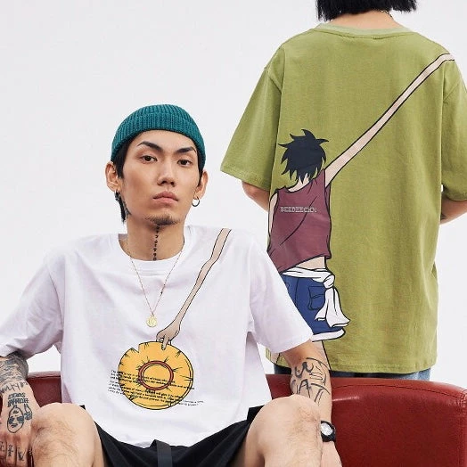 Adorable design of Luffy from One Piece reaching out his straw hat on both front and back.