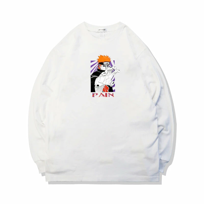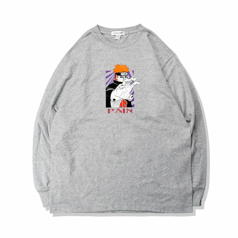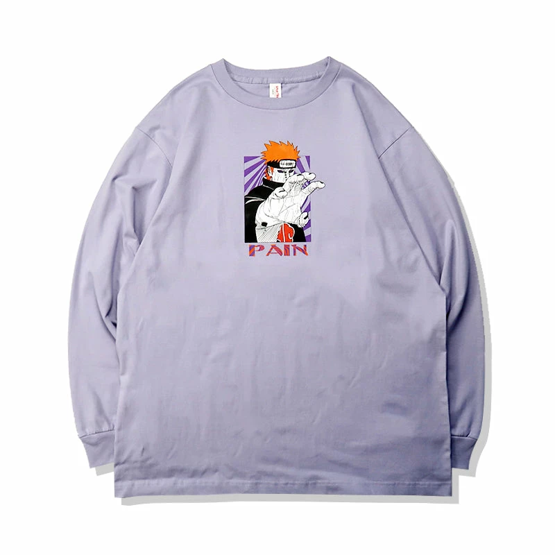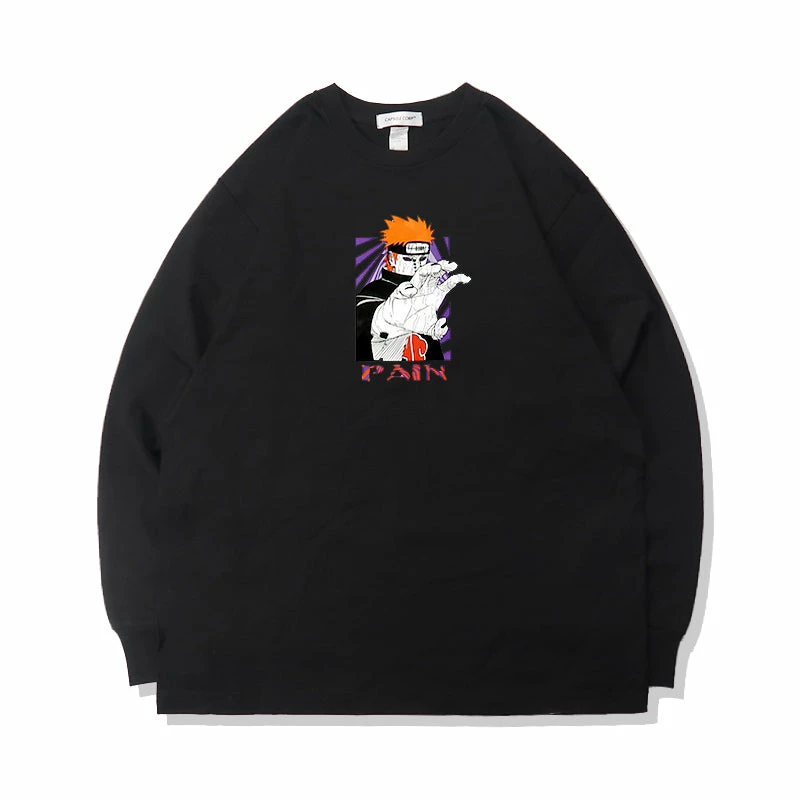 Front printing of Pain from Naruto anime reaching his hands with all sweats after fight. Four colors available.