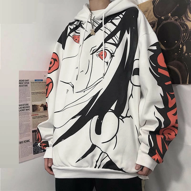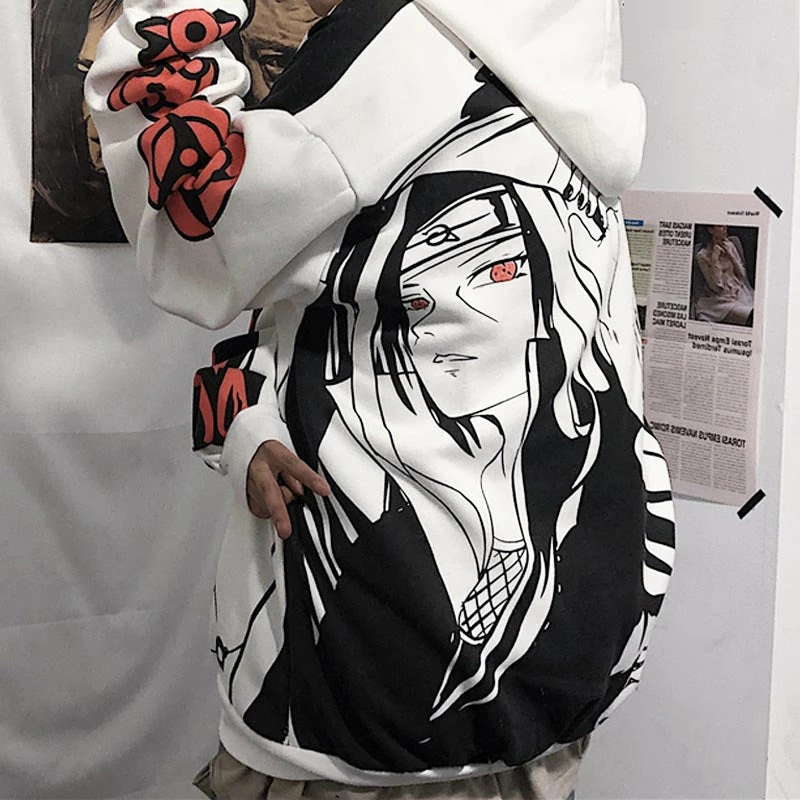 Uchiha Clan from Naruto fully covered on this hoodie and all forms of Sharingan printed on the left sleeve.