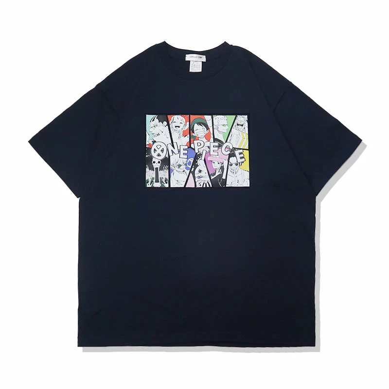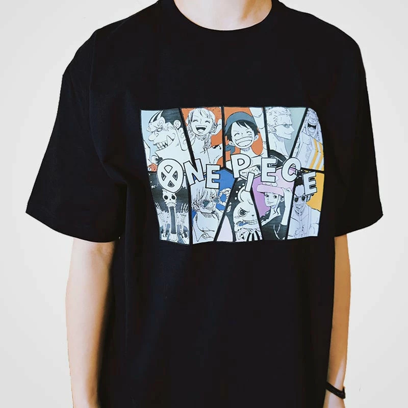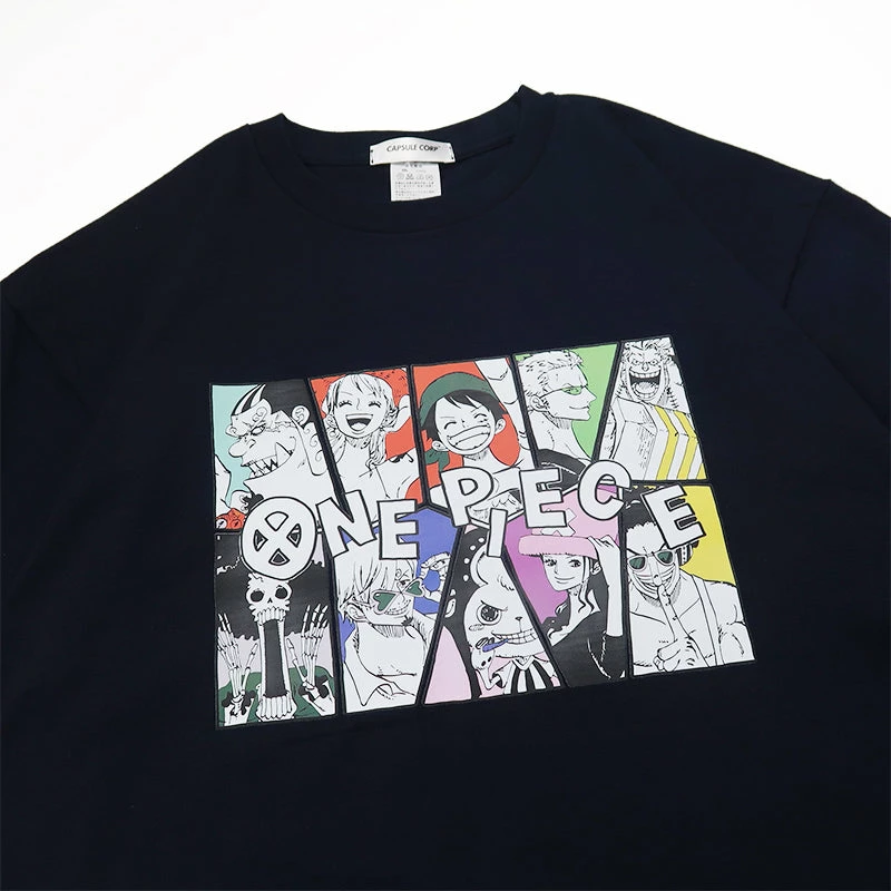 Straw Hat Crew group including Luffy, Nami, Brook and the rest are featured on the front of this tee, with the series’ logo on the top.