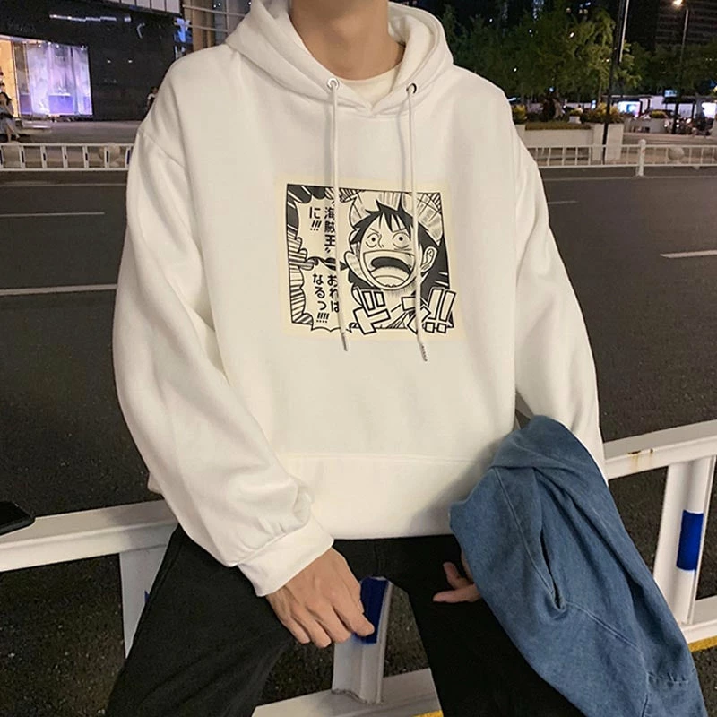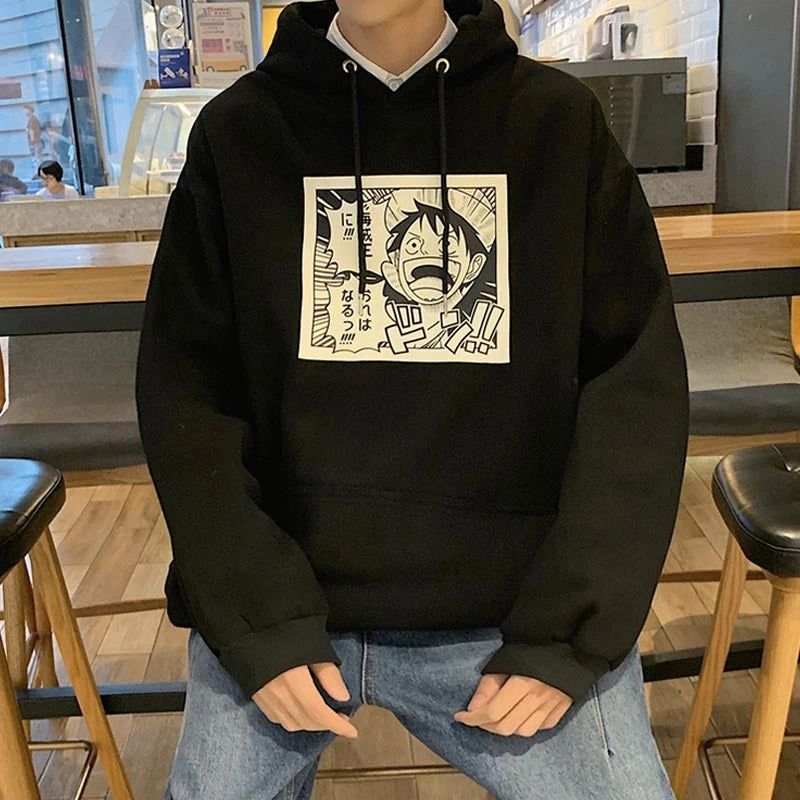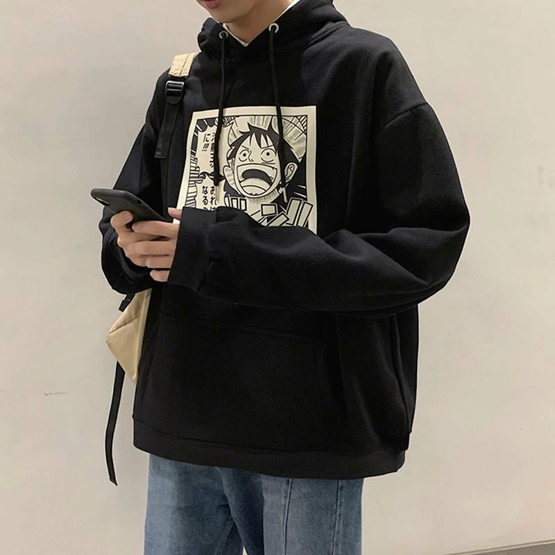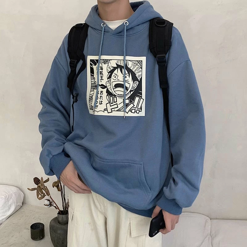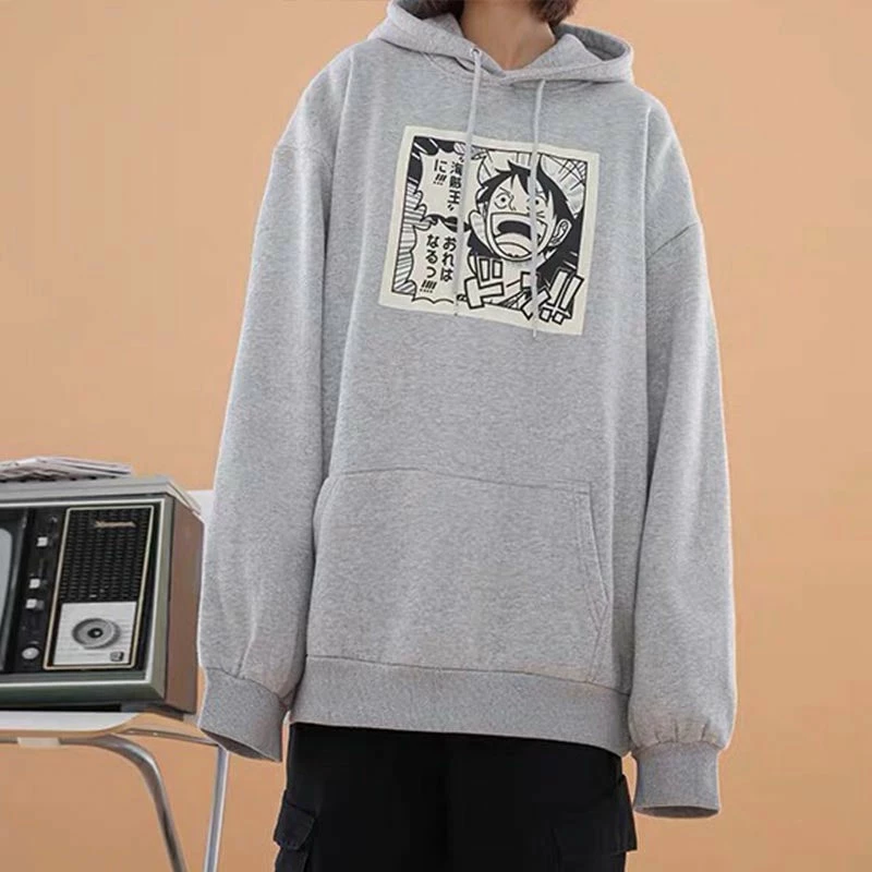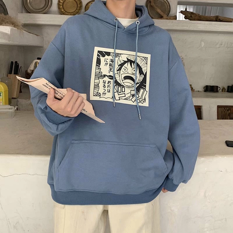 Luffy yelling with Japanese printed in a frame on front chest, blank back and kangaroo pocket.
