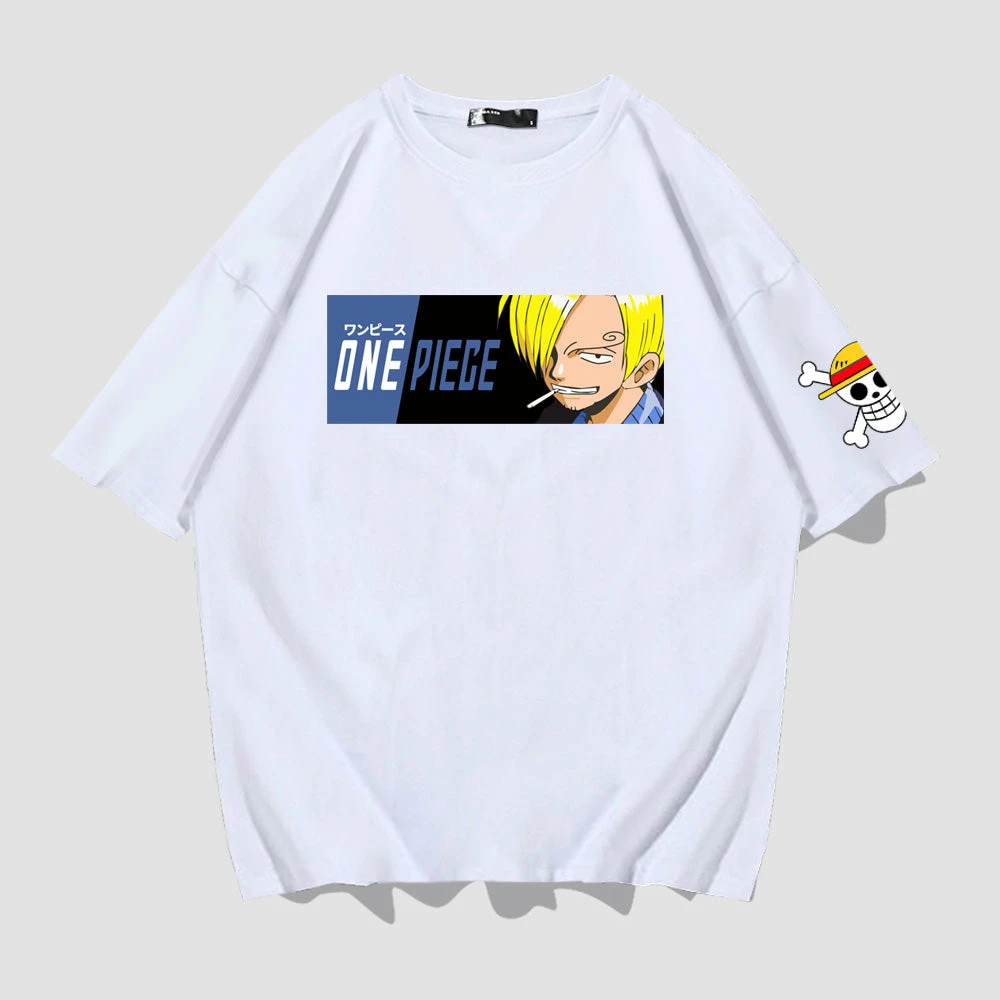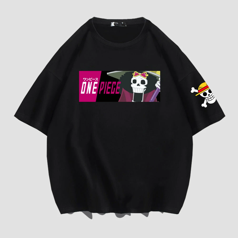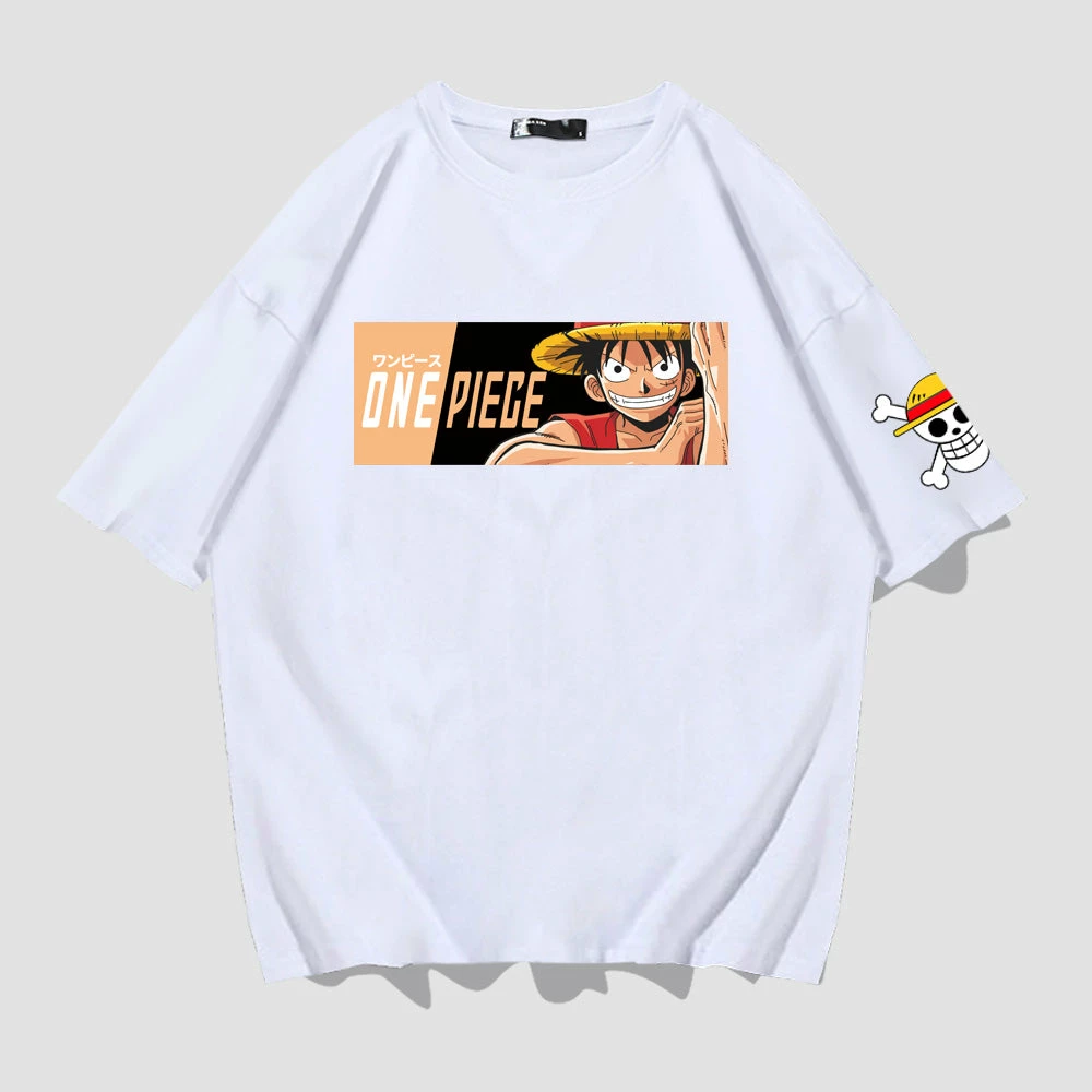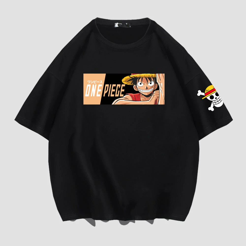 Rectangle printing with main Straw Hat Crew inside and One Piece skull logo printed on the left sleeve.