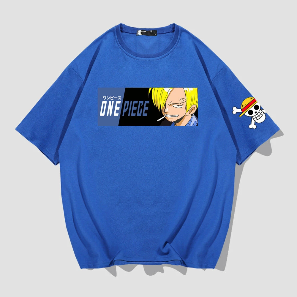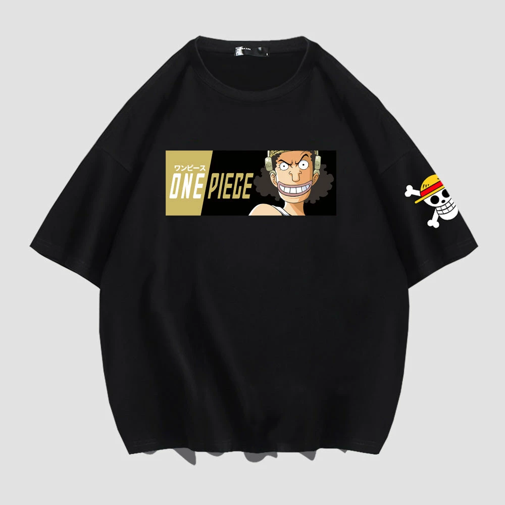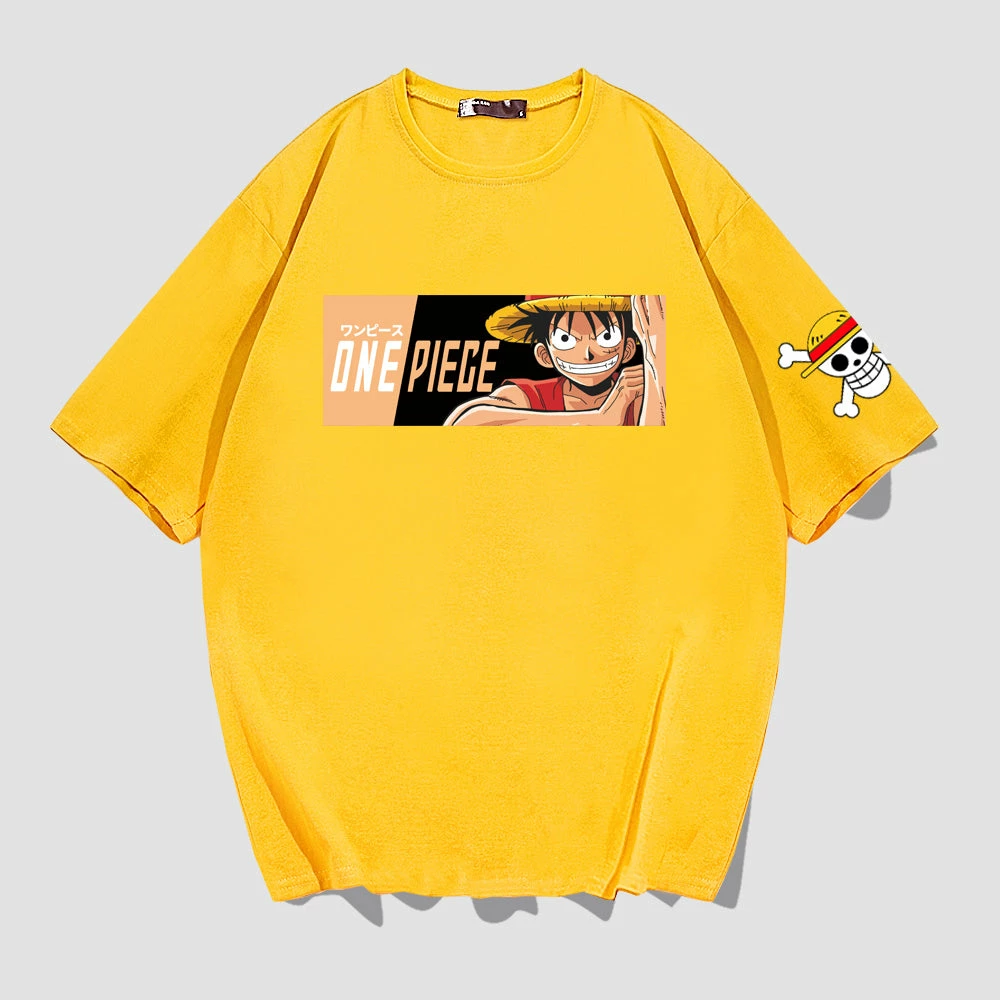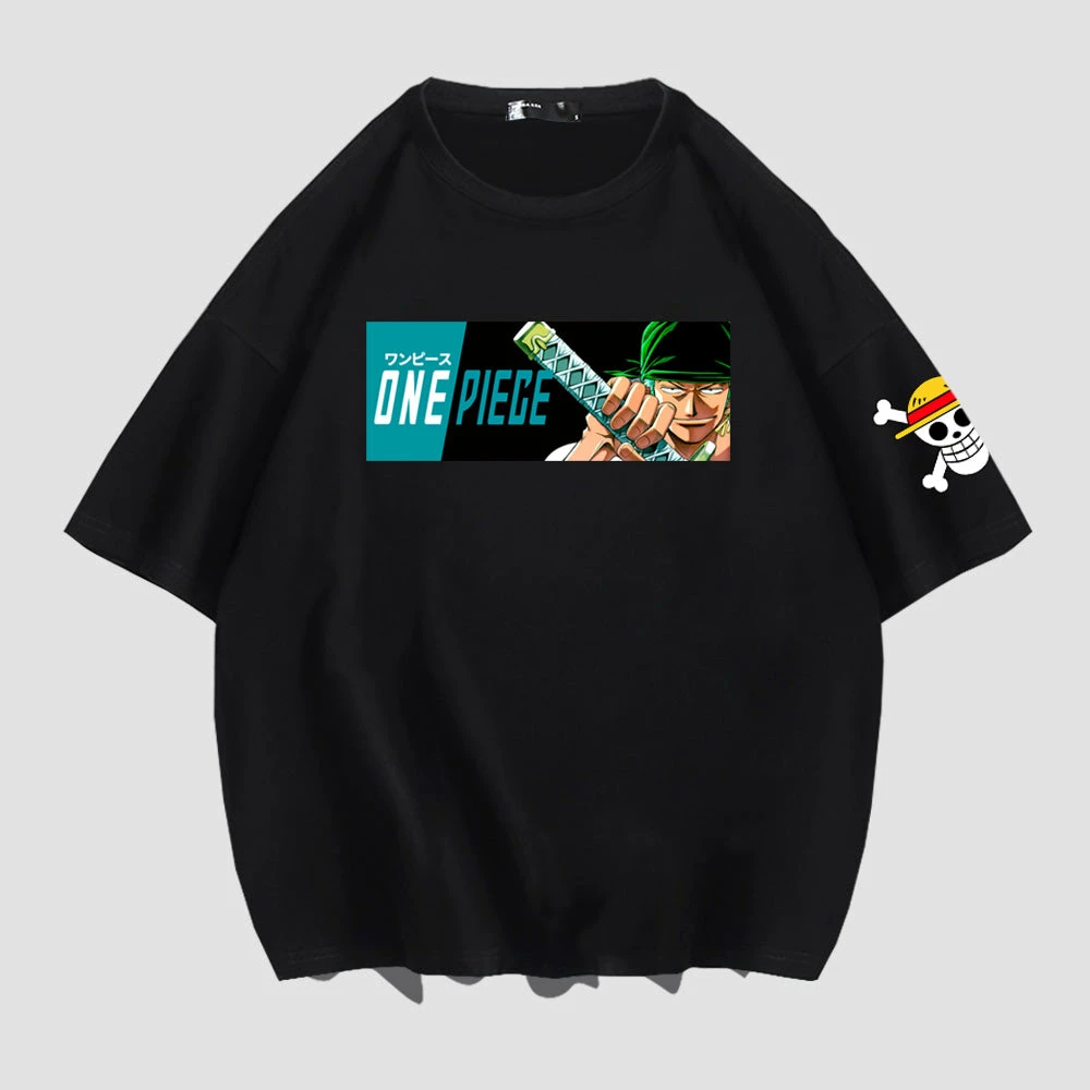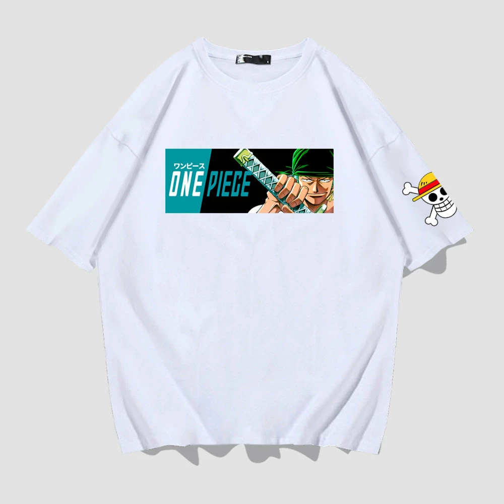 Rectangle printing with main Straw Hat Crew inside and One Piece skull logo printed on the left sleeve.