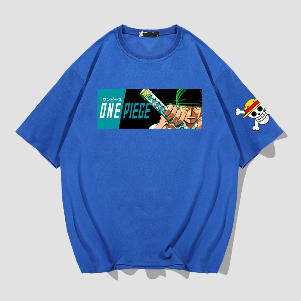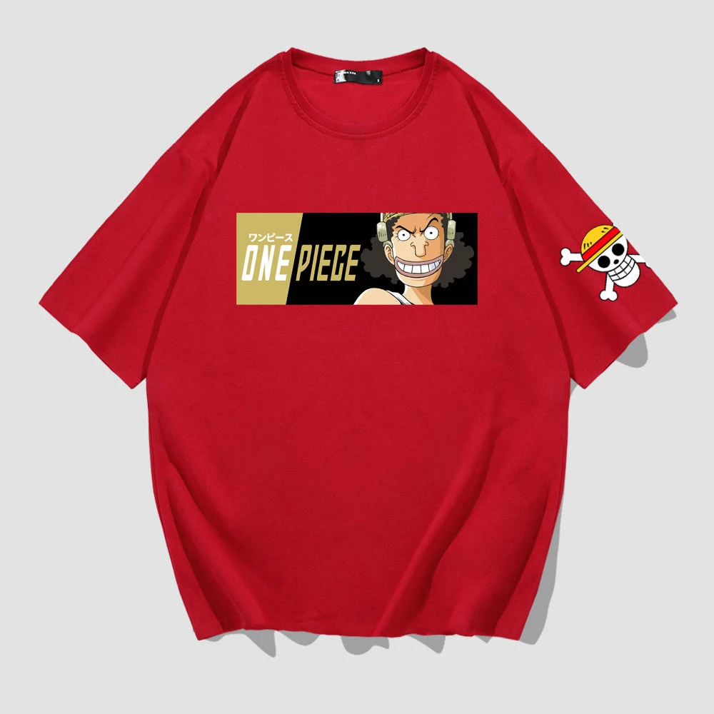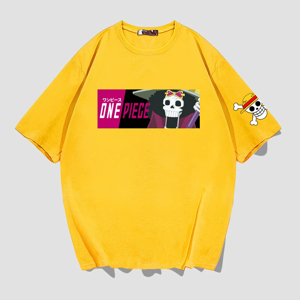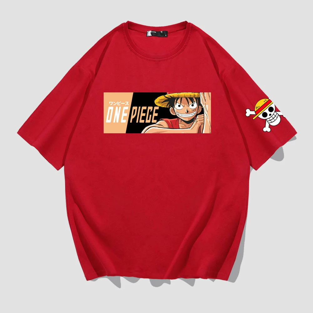 Rectangle printing with main Straw Hat Crew inside and One Piece skull logo printed on the left sleeve.