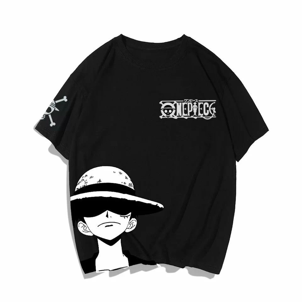 Luffy with straw hat in black-and-white sketch on the right side, classic One Piece logo on the chest and Straw Hat Pirates symbol on the sleeve – Totally represent One Piece fans.