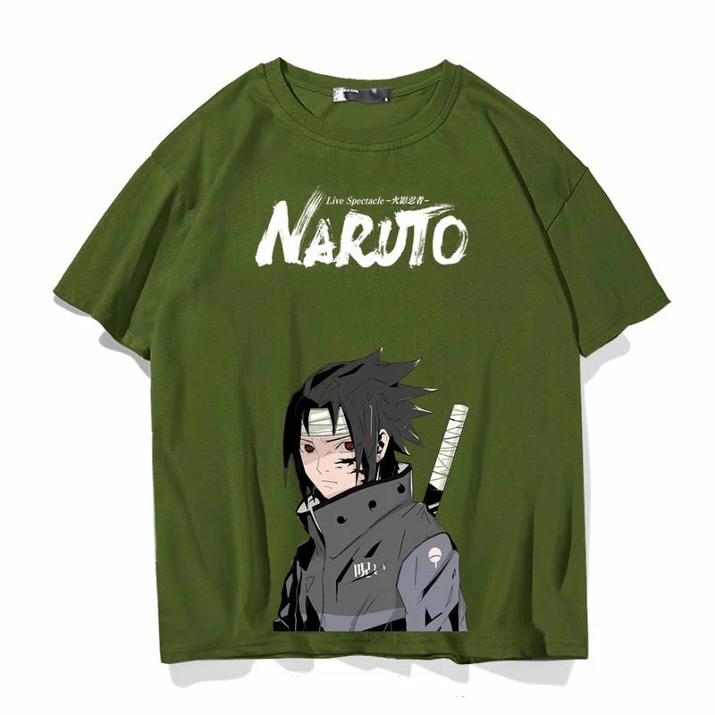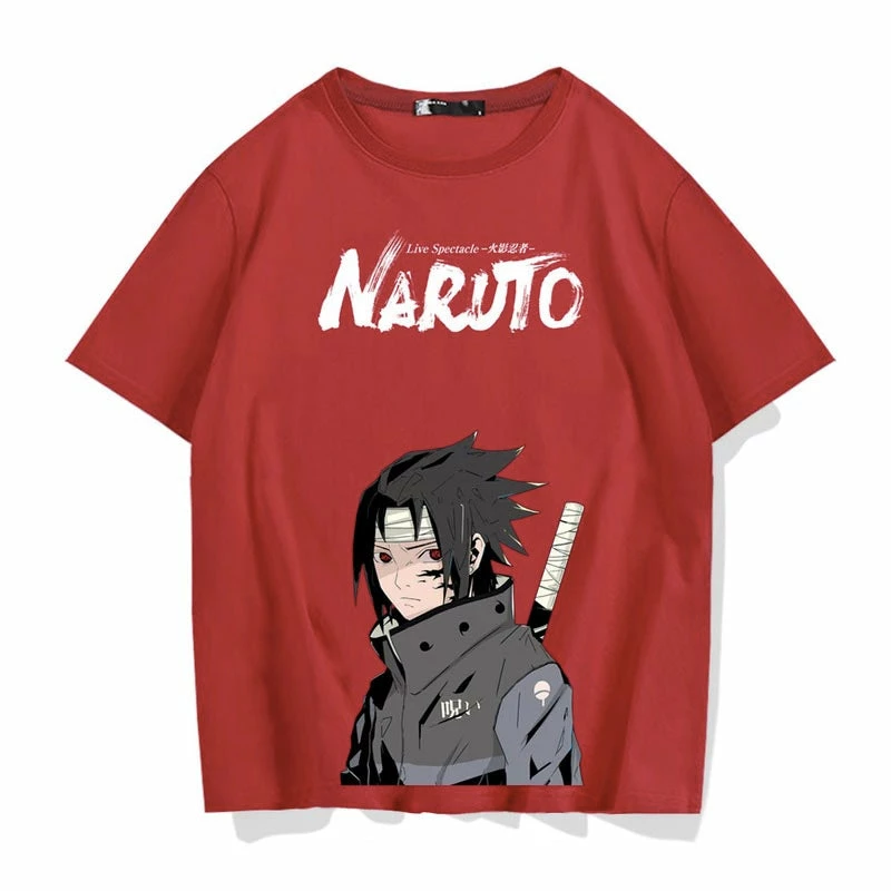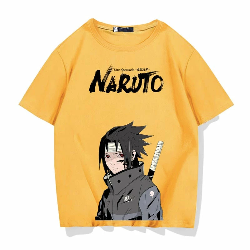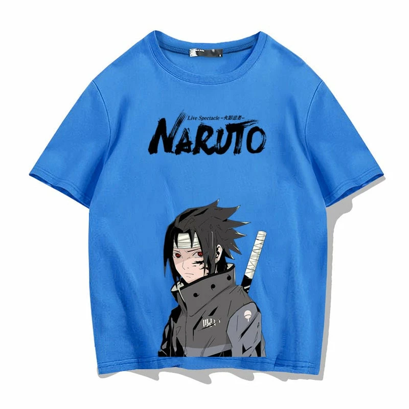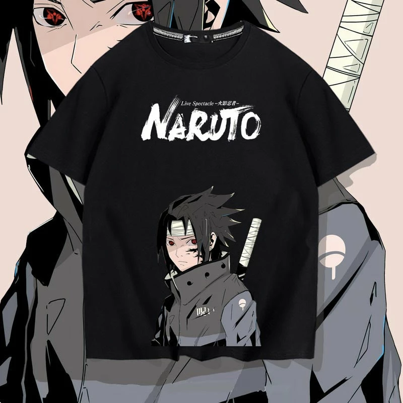 Sasuke Uchiha with his sword printed on the front bottom. Serious expressions on his face. Blank back.