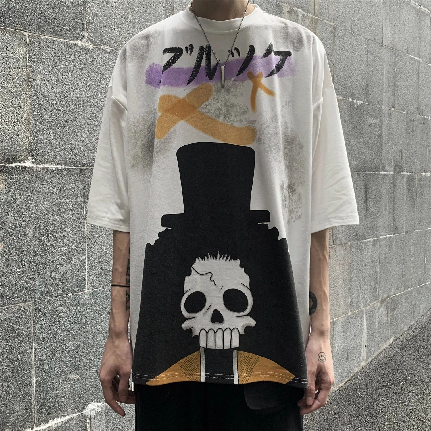 Doodled printing of One Piece characters fully covered on front.