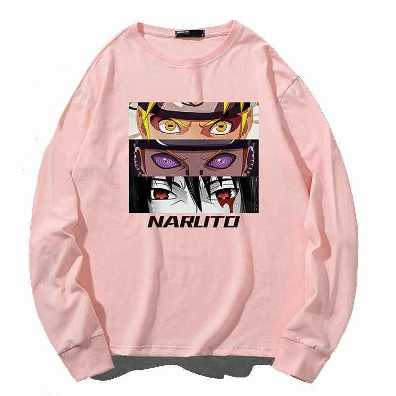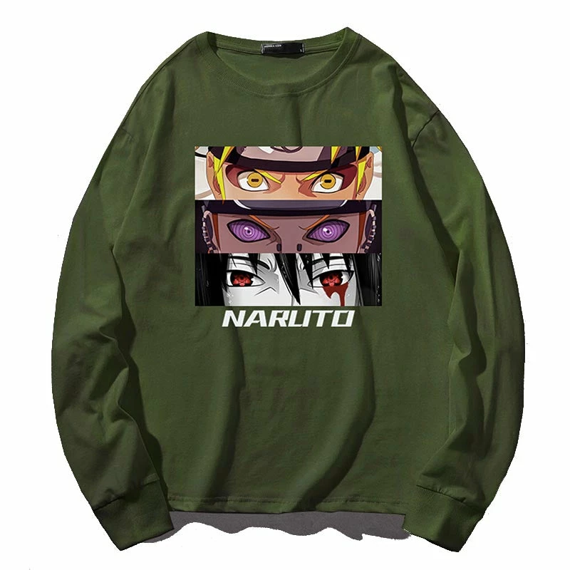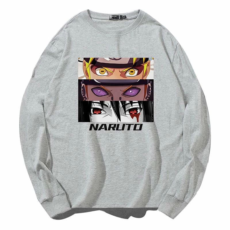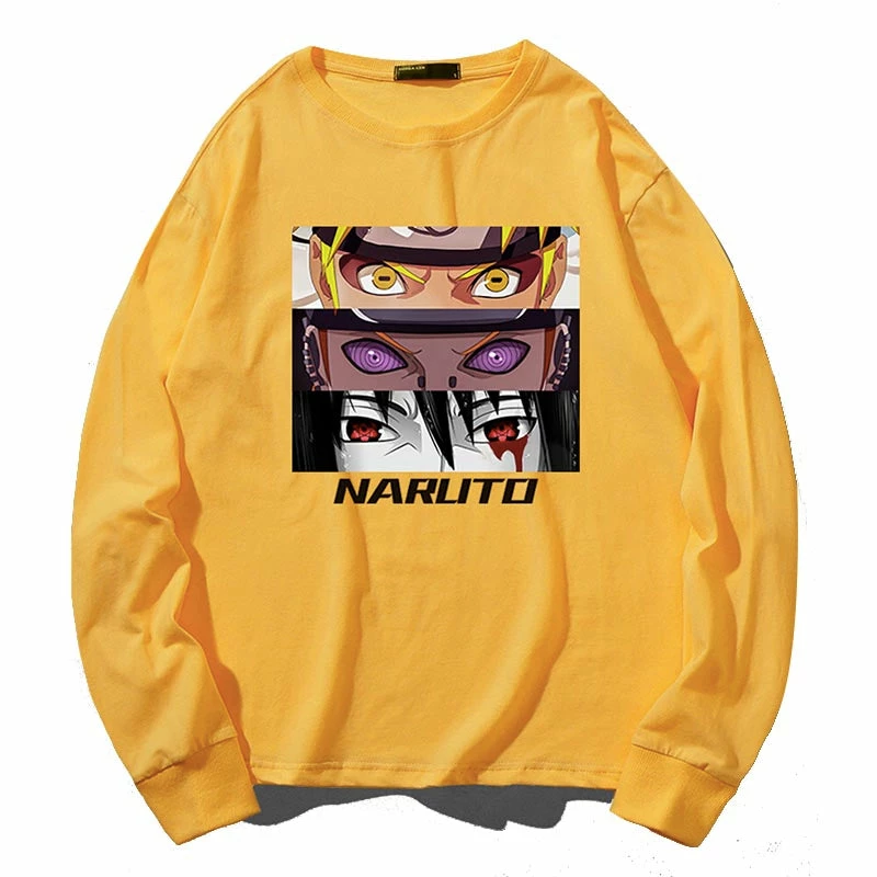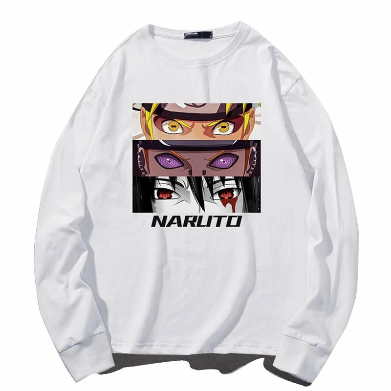 From top to bottom the eyes of Uzumaki Naruto, Nagato and Sasuke Uchiha printed on the front center.
